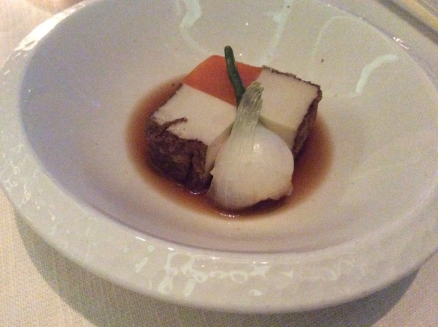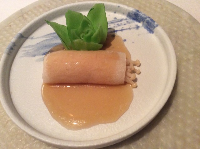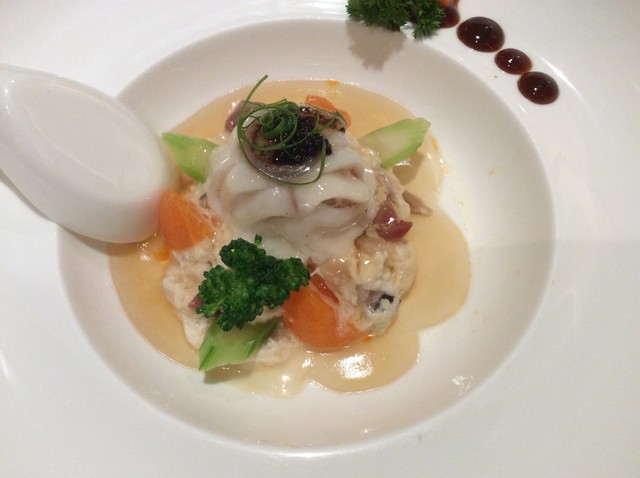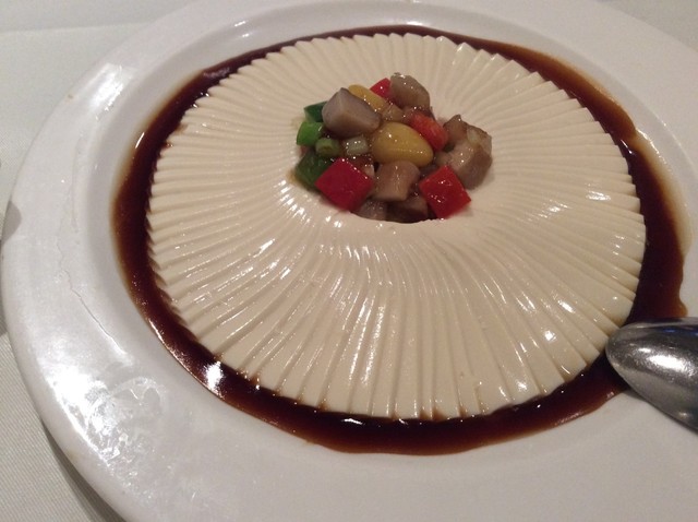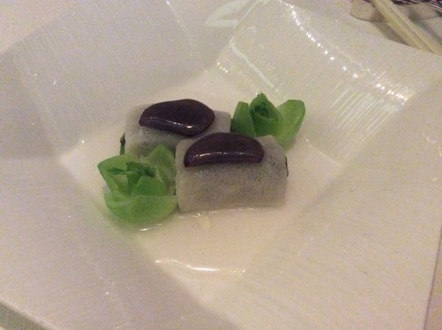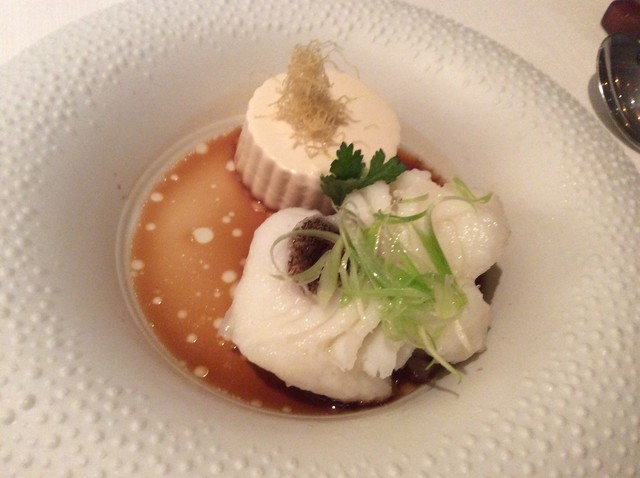 黒い魚卵、ハム、豆腐の蒸しハタ
