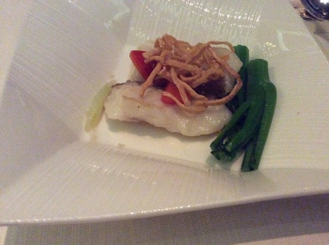 スジアラの切り身のねぎ焼きと翡翠卵白蒸し