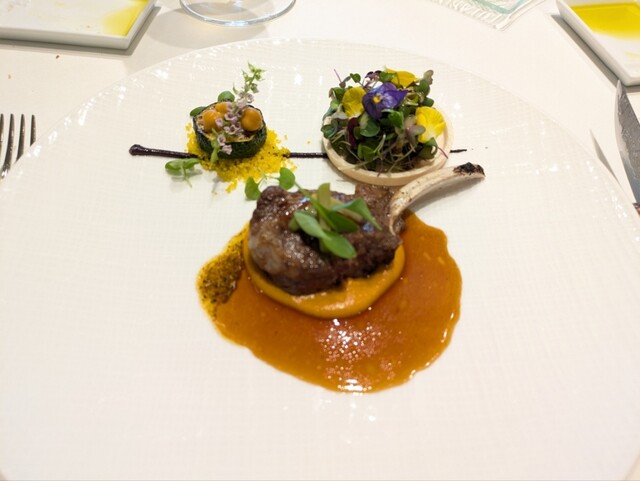 ◆オーストラリア産仔羊 マグレブ諸国のスパイス風味と共に、香り高いジュ・ダニョーとブール・ド・トマト 「江戸前ハーブ」の種亀最中タルトレット・ア・ラ・サラド