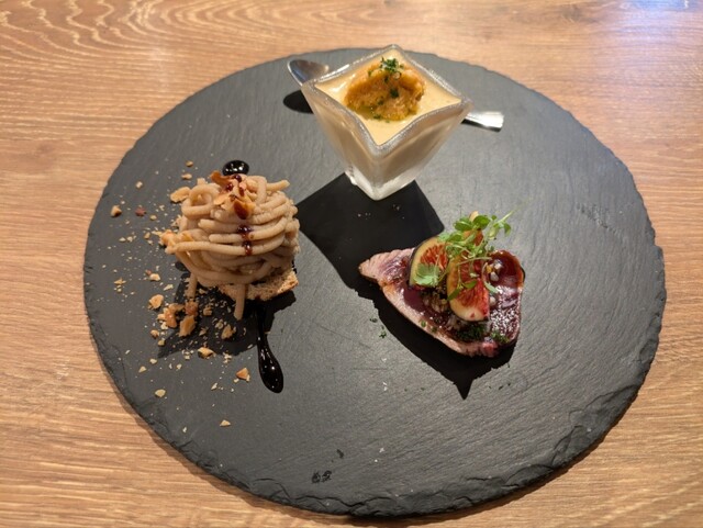 モンブランは、バターナッツかぼちゃがメイン材料で、ねっとりした甘さが特徴的。バルサミコ酢で酸味が加わり、さらに深みが。こちらもおいしくいただきました。