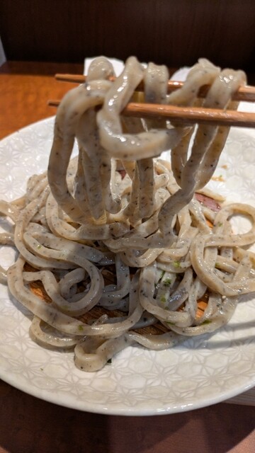 見たことないほどの極太麺で確かに御影石のようなつぶつぶがすり込まれています。