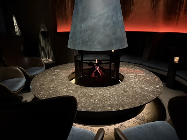 隠れ家的な箱根のブティックホテル。エントランスから入ると一枚板のロングバーカウンター、後ろは森林がパノラマビューで広がります。後ろには暖炉を囲むソファ席も。