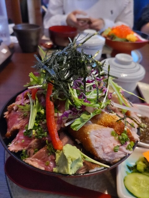 今日は、新鮮なお刺身の贅沢な「極み海鮮丼・天ぷら御膳2800円」海鮮丼系はタレを選ぶことができます。自家製醤油(練りゴマと醤油のブレンド)と本生マグロホホテキ丼2200円を大盛りで頂いてきました(◍•ᴗ•◍)❤