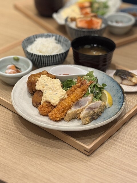 名物のレアアジフライに海老フライ、チキン南蛮、いくら、焼魚など特盛のおかずです笑