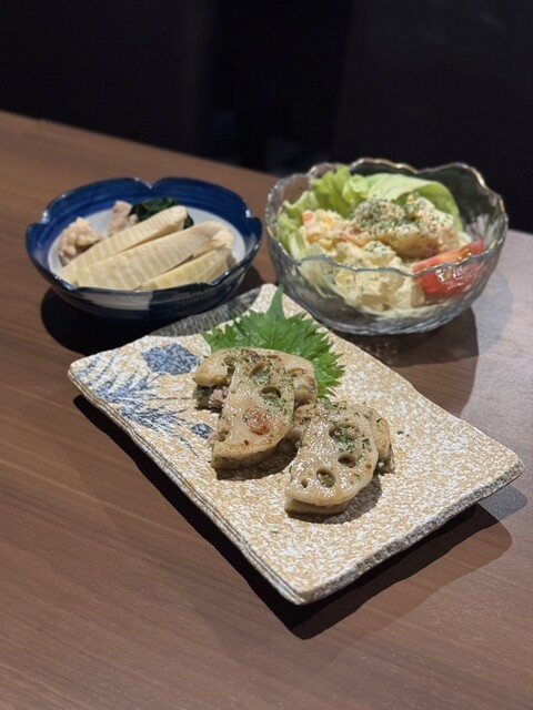ポテトサラダに蓮根挟み焼きタケノコの煮物