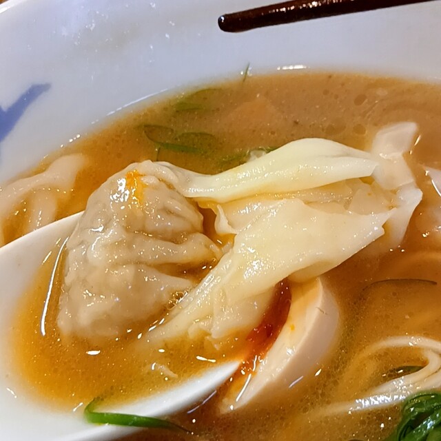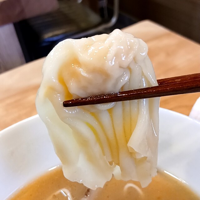 細ストレート麺はスープと相性抜群で、具材は 豚ロース・豚肩ロース・海老ワンタン・肉ワンタン・味玉・太メンマ・九条ねぎ と贅沢な内容!