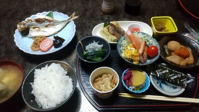 前菜3種、新鮮な刺身(アジ、ブリ、タイ、イカなど)、焼魚(カマス)、煮魚(イシダイ)、揚げ物(カレイ)、鮭の酒粕鍋と地元の魚三昧でした。朝食も自家製のアジ干物など品数豊富てとても満足しました。