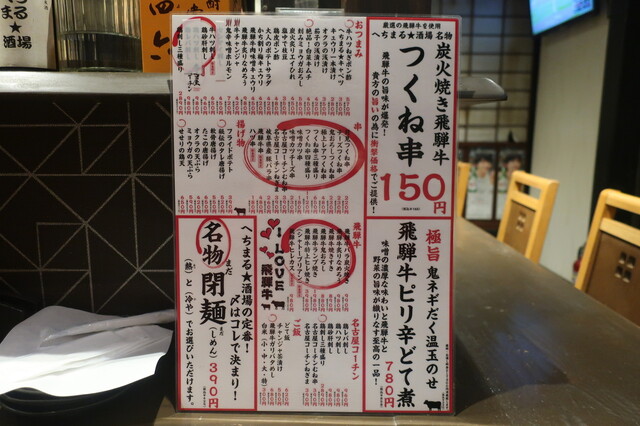 馬鹿ジョッキとつまみに飛騨牛どて煮780円と飛騨牛つくね二本300円を注文。飛騨牛といっても高級部位だけでなくいろいろな部位があるので、どて煮やつくねにお手軽値段で出せる部位を使っていると思いますが、まずはおいしくいただけて満足です。先に軽く飲んで食べてきたので、飛騨牛ハラミとか名古屋コーチンとか気になるメニューがありましたが、パスしました。