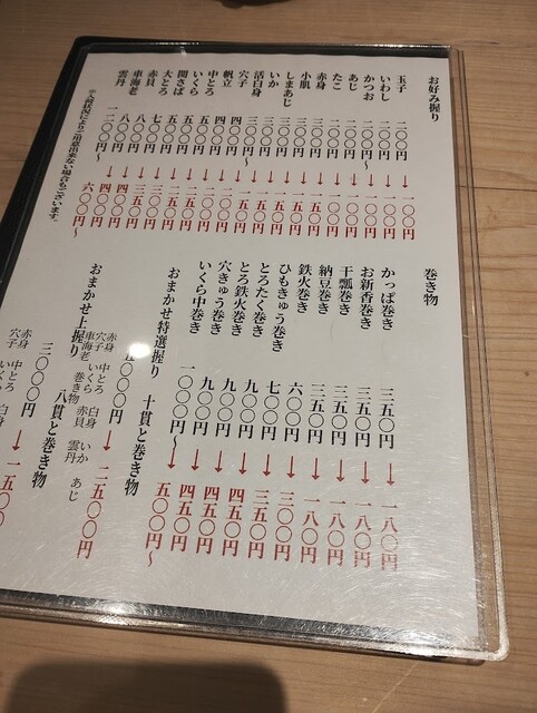 現在、17時から18時までの間、全品半額サービスを実施していて、お好み握り、おまかせ寿司が半額になるので、おまかせ特選寿司10貫と巻物で5000円が2500円でいただけます。ただしドリンクの酒類は通常価格になります。