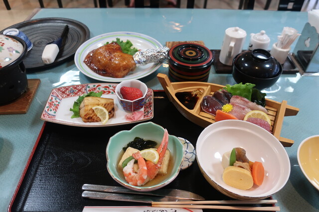 ここのよさは食事が充実していることです。今回は阿波尾鶏のスパイシー焼き付きのプランにしました。基本の刺身、焼魚、肉陶板焼き、小鉢が付いていてこれだけでも十分な量ですが、さらに、阿波尾鶏の大きな骨付鶏が付いてとても満足でした。鶏は柔らかいひな鳥でした。