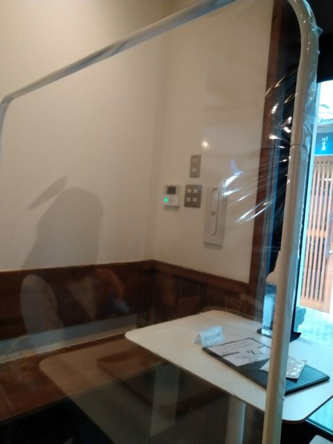 店内各テーブル毎に遮断シートがあります。オーダーは座ってからレジの所へ行って注文します。本日ほうじ茶フローズン、抹茶クッキーフローズンと伊勢抹茶氷を注文しました。