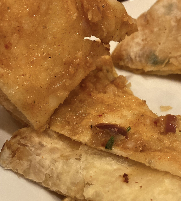 食感は小麦で作ったものと違いもっちり感はなく、もそもそとしてる。豆腐をつぶして固めてこんがり焼いたようなイメージに近いかなと。スパイスが混ぜられていて、ふんわりといい香りがしてきますが、味付けらしき味付けはさほどなく、ほぼ豆のシンプルな味そのもの。うまいかどうかというより、こういう食べ物もあるんだと楽しむような感じ。単純なおいしさで言えば、同じような並びのチャタマリの方がとっつきやすいような気がします。