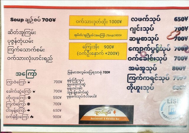 日本語メニューもありますが、大半はミャンマー語の読めないものなのがまた本場感強くて素敵です。