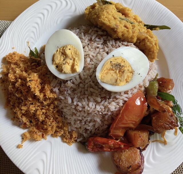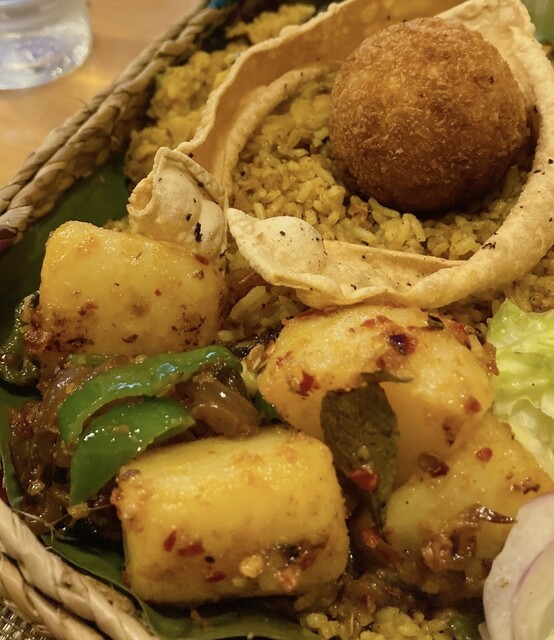 ライス&カリーの内容は、ライス、豆のカレー(パリップ)、チキンカレー、スリランカのコロッケ(カトレット)、ブロッコリーの炒めもの(テルダーラ)、水菜とココナッツの和え物(サンボル)、レンコンのココナッツミルク煮(キラタ?)、サトイモのスープカレー(ホディ)、パパダム、ドライフィッシュ。