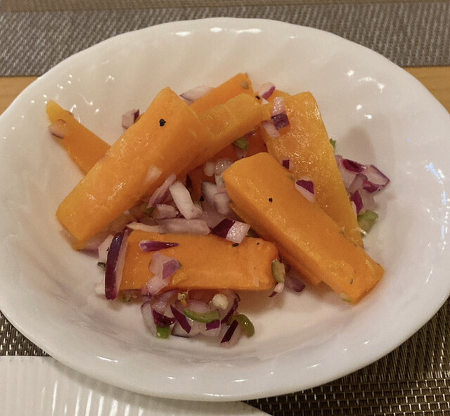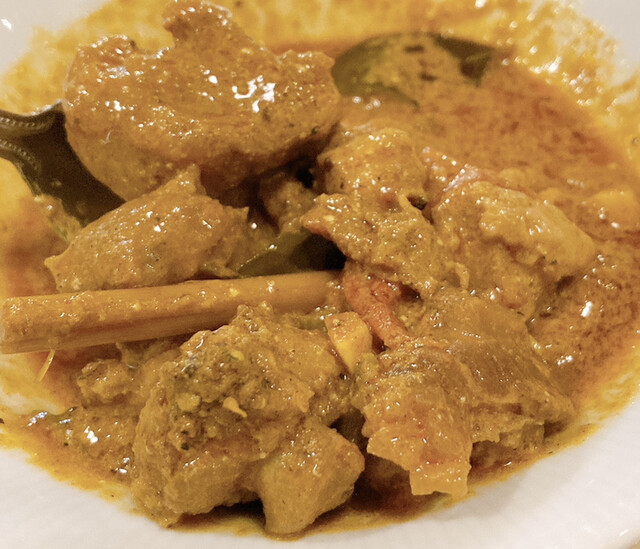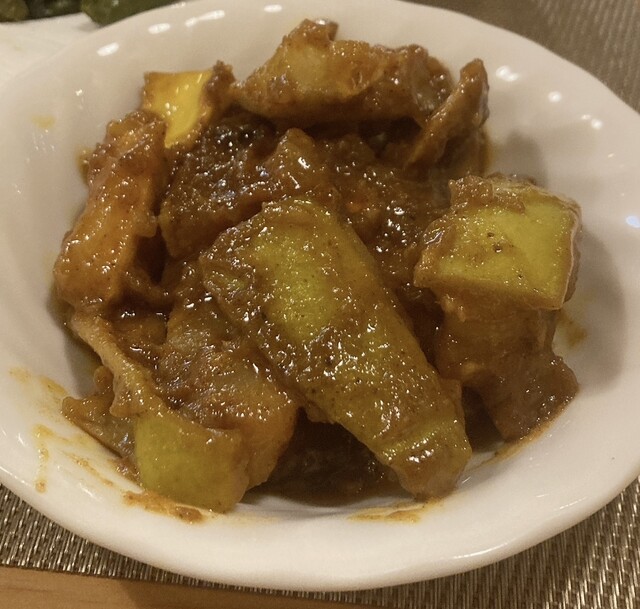 大きなマンゴーごろごろのフルーティで甘酸っぱ辛いドライカレーみたいな。缶詰のカットマンゴーとかじゃありません。濃いめでこってりしてるのだけど、マンゴーの甘酸っぱさととろみがなぜか辛いソースと合うのが意外性が不思議。
