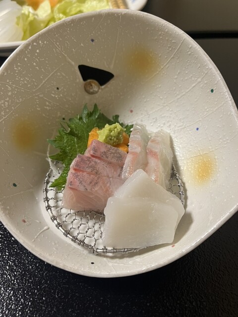 蟹刺し甘い!!鮮魚刺しも美味しい!いか、カンパチ、鯛の3点盛りでした( ´∀`)