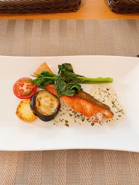 鮭は外側パリパリ、身はふっくらとしていて、バジルのソースがとてもマッチしていて美味しい。