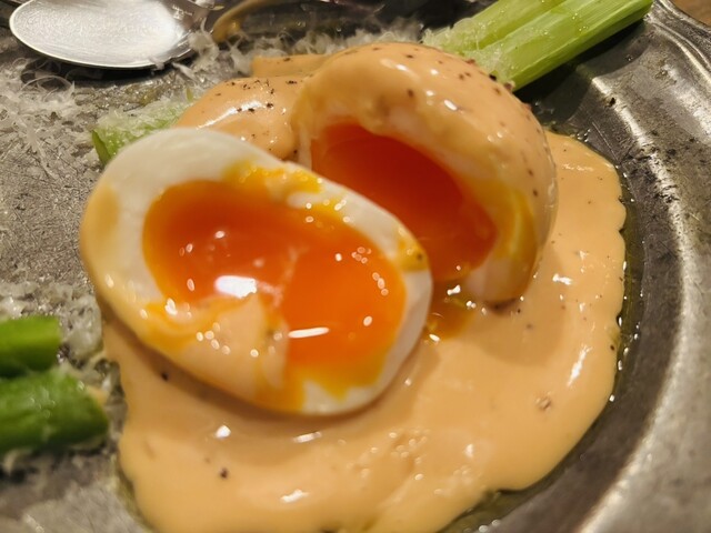 ツマミにアスパラとウフマヨ、鶏白レバーパテ、自家製のフォカッチャを出してもらう。どれも本当に美味しいなあ✨締めに肉を焼いてもらう