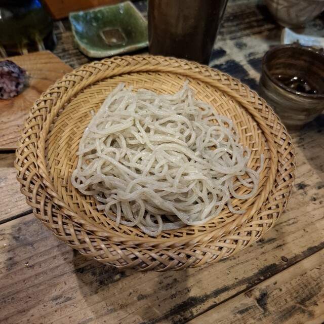 冷たいお蕎麦2種、温かいとろろ蕎麦、古代米のおにぎり、だし巻き玉子、牛すじ煮込み、熱燗