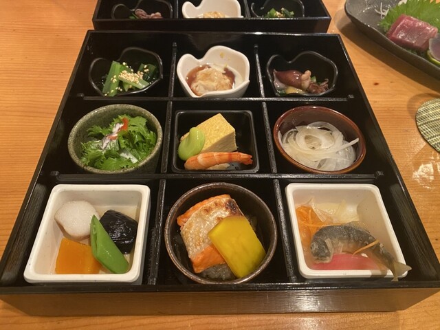 昼の献立は刺身や天ぷらの御膳のほかに、特製御重の刺身付き御膳が!!