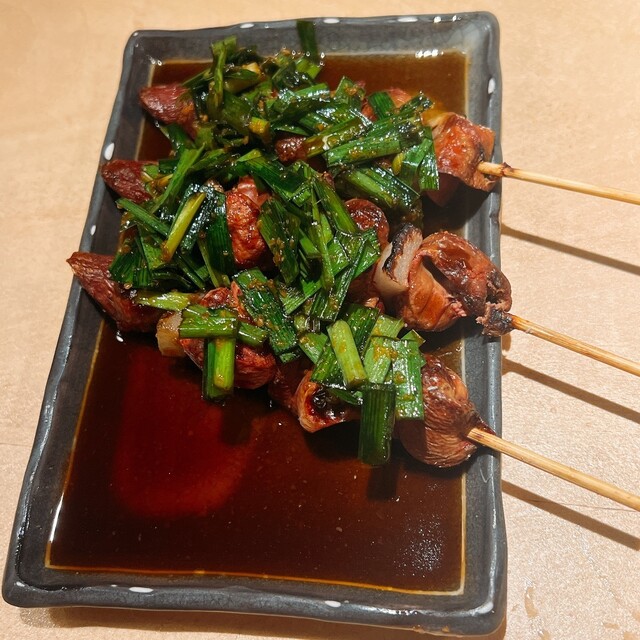新鮮鶏レバーにニラ醤油がかかったニラレバ串、