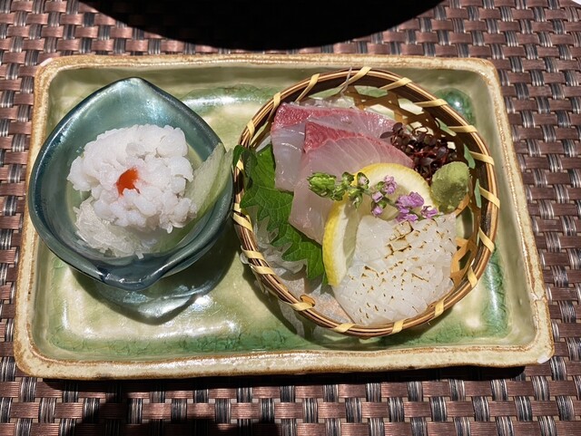 次にお造里。近海もののカンパチ、鱧、烏賊。すべてねっとりとした美味しさで、小豆島醤油にも相性ぴったし。