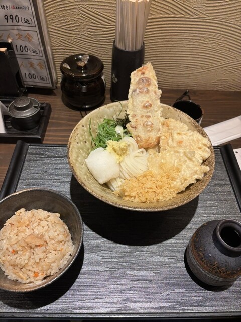 おすすめを聞くと、カレー、かす、とり天なんかがよく出てるとのことだったので、とり天ぶっかけ中盛(1.2倍)とかやくご飯を注文