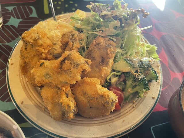 ・大粒の牡蠣フライ6個、大盛りサラダとレモンがトッピング。