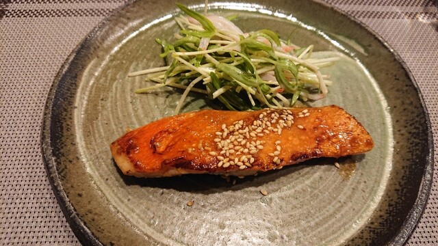 厚めに切られた身を刻み昆布やキノコ類とソテーし、アクセントに七味がかかっています。