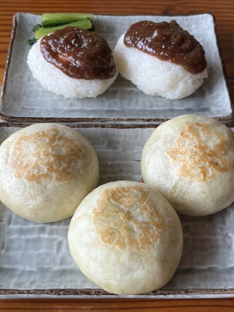 今回は石臼挽蕎麦の大盛りとおやき3種(ナス・切干大根・野沢菜)、くるみおはぎを注文。