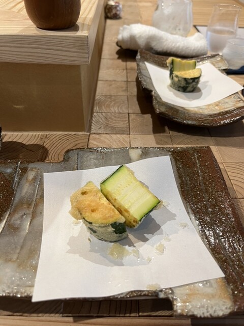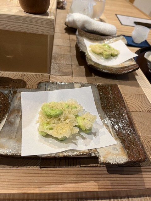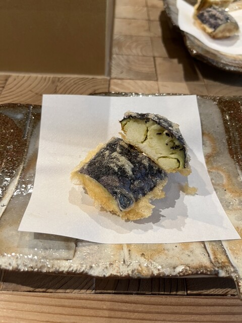 ズッキーニ、アスパラ、ナス、豆類など、季節の野菜が次々と登場。それぞれの食感と風味を最大限に引き出す揚げ加減は、まさに職人技。ナスのとろけるような口当たり、アスパラのシャキッとした歯ごたえ、豆のほくほく感—すべてが異なる表情を見せる。