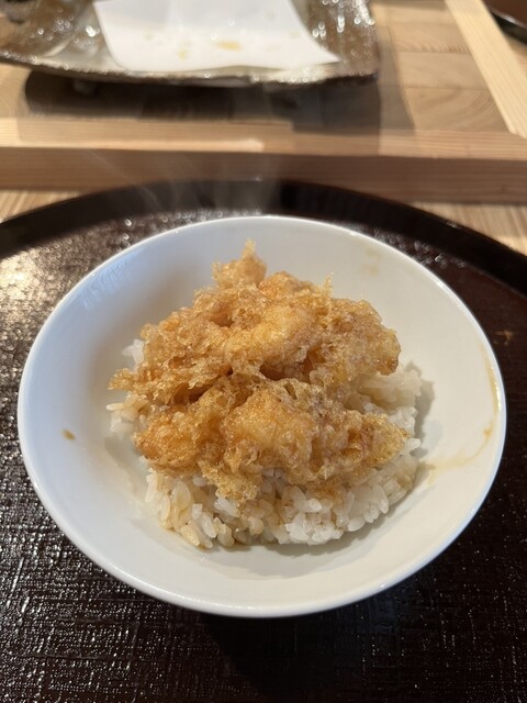白身魚はふっくらと、ホタテは柔らかく、それぞれの持ち味を活かした揚げ方。衣の香ばしさと魚介の旨みが重なり、口の中で静かにほどけていく。塩で食べると素材の甘みが際立ち、天つゆでは香りが引き立つ。