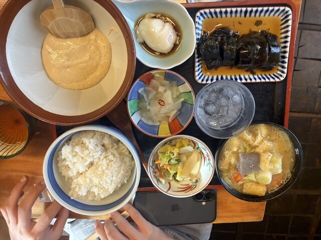 そして席に案内され、私はけんちん汁(大)を注文。家族は麦とろろのセットやけんちんうどんセットを注文していたので、ちょこちょことつまませてもらいました。