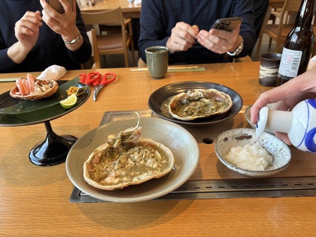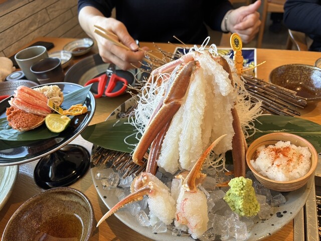 3回目の訪問で、1番小さなサイズを、2匹、茹でと、生、焼き、カニみそ丼、付き合わせの刺身盛り、セイコ甲羅盛りを頂きました。