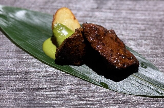 牛ハツのグリル。ブラックミントのワカタイソースが添えられてる。漬け込んだ味付けも良いけれど、説明忘れちゃいました。