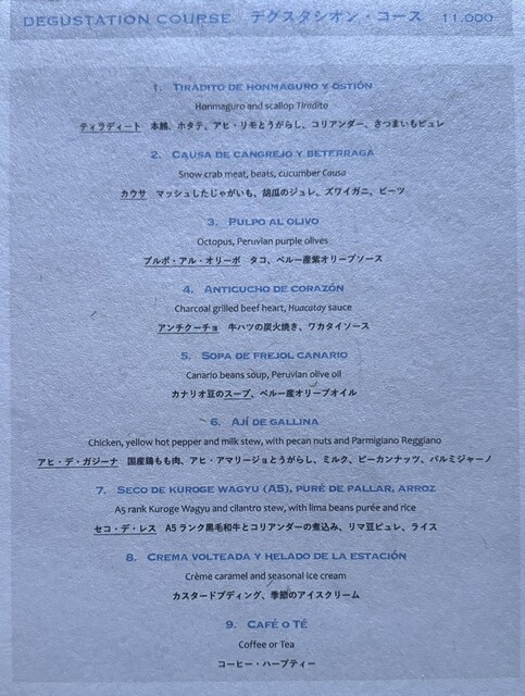 うーん、ペルー料理恐るべし。今更だけどヌーベルペルヴィアンと言ってもイイのだろうか。でもティラディートやプルポアルオリーボの様に、日系移民の影響も受けたなんて、深〜い歴史がある料理と聞くと、ちょっと違う。多様な文化が掛け合わされた、その複雑な味わいに惹かれますなぁ。五島で食べた、メキシコ料理を修行したシェフのセビーチェも衝撃的だったけれど、特にこのティラディートのソースはただものではないです。ホント旨いわー。