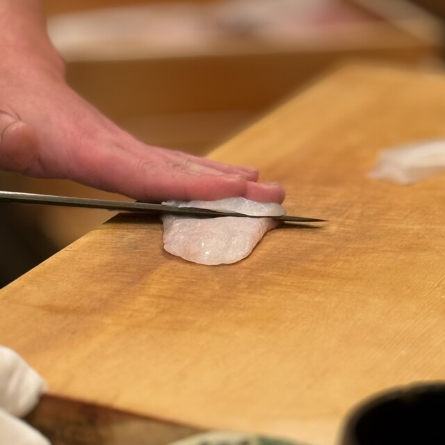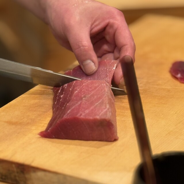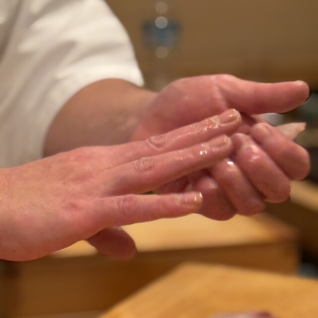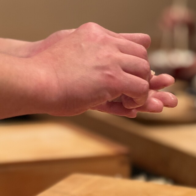 刺し子を飾った額と店の奥には酉の市立派な熊手、シンプルだけど勢いのある店内。にこやかな気遣い細やかな大将を囲む様に「く」の字型のオープンカウンター。切る、握る、大将の所作を見るだけでワクワク楽しい。