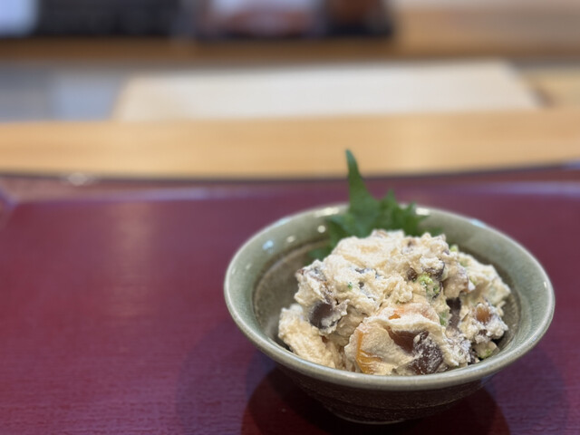 鏑の豆腐、季節の白和え(柿、ブロッコリー、椎茸)、牡蠣の有馬煮、そして、バッテーラ。