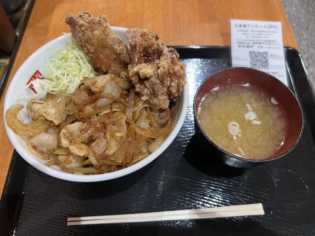 生姜焼き丼に前回訪問時のアンケート特典の唐揚げトッピングを戴きました。
