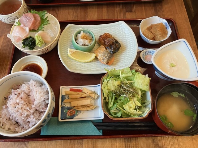 少しずつ色々なおかずが選べます。私の鉄板セレクトは刺身と焼魚。お相手は季節限定の大ぶり牡蠣フライ。