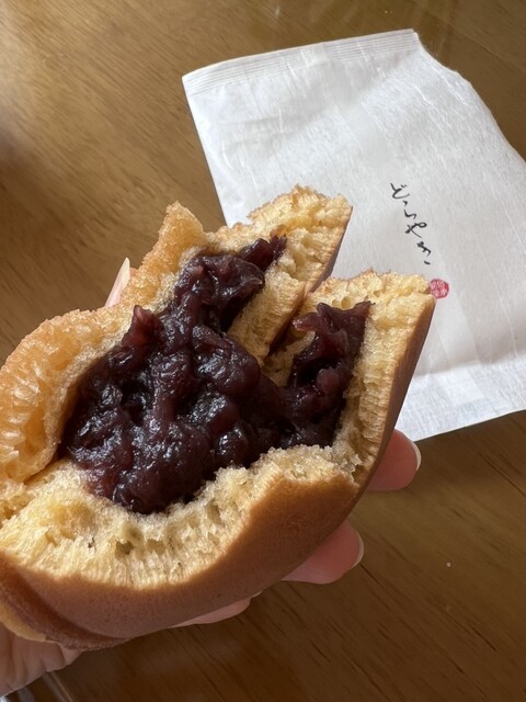 焼きたてどら焼きと比べると、ふわふわ感強めで、バターのおかげでしっとり。甘さは控えめで、生地のあじも強くなく、優しいお味です^_^