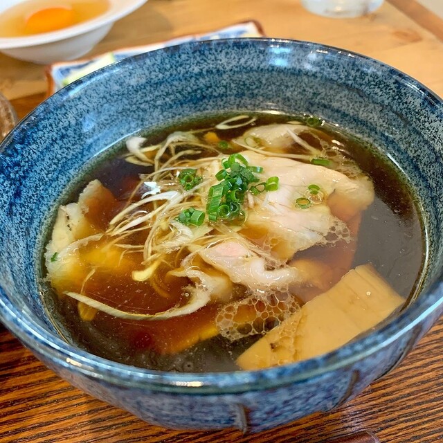 醤油らぁ麺のスープは、鶏主体な動物系スープの奥行きある旨味と鶏油のコク、醤油が合わさるふくよかな味わい