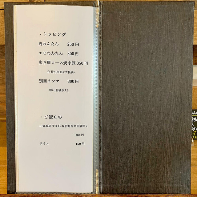 チャーシュー2種、肉ワンタン、メンマ、白髪葱、生黒胡椒、柚子皮
