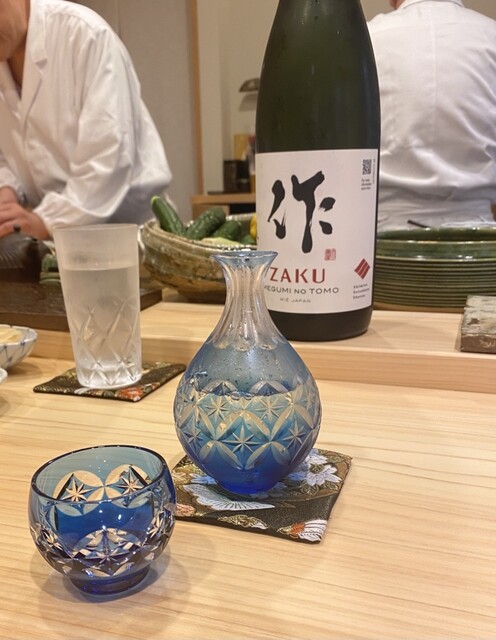 三重県の日本酒。ブルーの切子の徳利が美しく、フルーティーで軽やかな味わい。