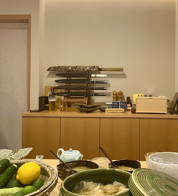 エレベーターを降りた瞬間から、ずらりと並ぶ胡蝶蘭がお出迎え。個室が3部屋、檜のカウンターが10席。こじんまりとした造りながらも、カウンター前には夏野菜が飾られ、ゆったりとした時間が流れていました。着物姿の女将さんも丁寧にご案内くださり、柔らかな雰囲気の中でのひとときに、心がほっとします。