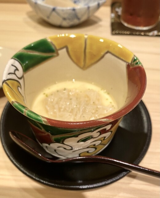 上に裂いたホタテ、餡の旨味がふわり。茶碗蒸し自体もなめらかで絶品。