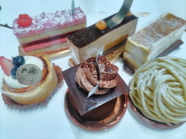 左上から時計回りに、フランボワゼット、ピエモン、ミルフィユオフレーズ、モンブラン、ショコラルー、ミキュイ