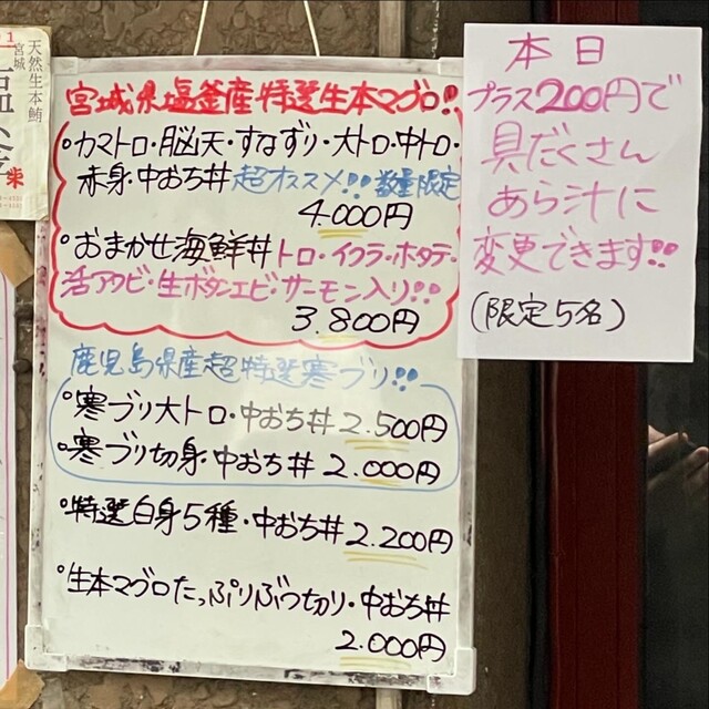 オーダーはカマトロ、脳天、すなずり、大トロ、中トロ、赤身、中落ち丼¥4,000