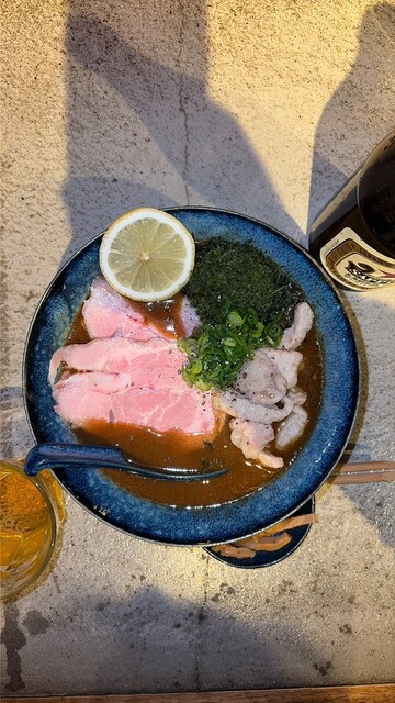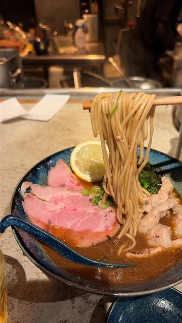 ほどなくして配膳。さらっとしたカレースープは出汁の風味豊かでスパイシー。細めのストレート麺はザクっとした歯触りが心地よくスープ絡みも良い。歯ごたえのあるシマチョウも厚めのレアチャーシューも美味い。これは相当美味い。今年の暫定一位。年明けてまだ半月やけど笑