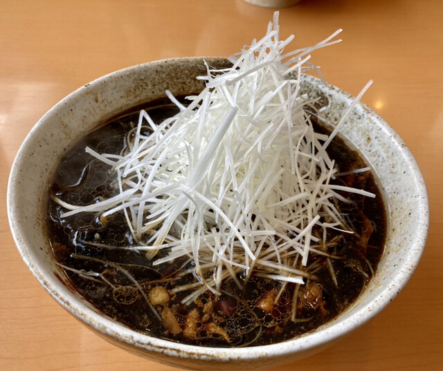 堪らん色目、真っ黒に白髪ネギが映えるの